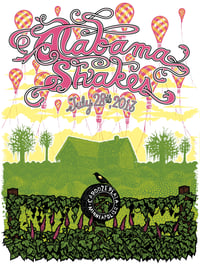 Hand-Illustrated poster for Alabama Shakes, Cabooze Plaza, Minneapolis, MN, 7/28/13, by Benjamin Nylen, 18"x24" 4-color screen-print on 100 lb. Cougar White, printed at Shelterbelt Studio, Minneapolis, Minnesota. Signed and numbered edition.
